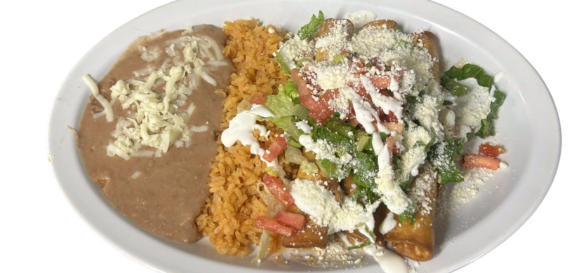 Choice of shredded beef or shredded chicken rolled in a tortilla and deep fried, topped with lettuce, special tomato sauce, sour cream, and tomatoes, served with rice and beans.